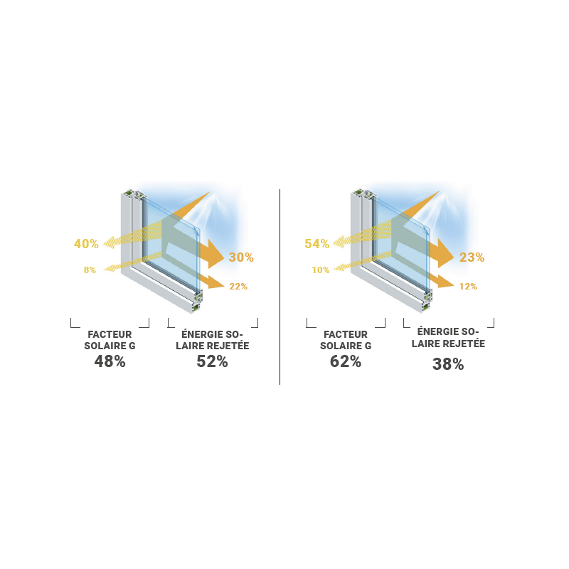 The solar factor (G) of a pane is the ratio of the total energy entering a room through the pane to the incident solar energy. This total energy is the sum of the solar energy entering by direct transmission and the energy given off by the glazing to the interior environment as a result of heating by energy absorption.
