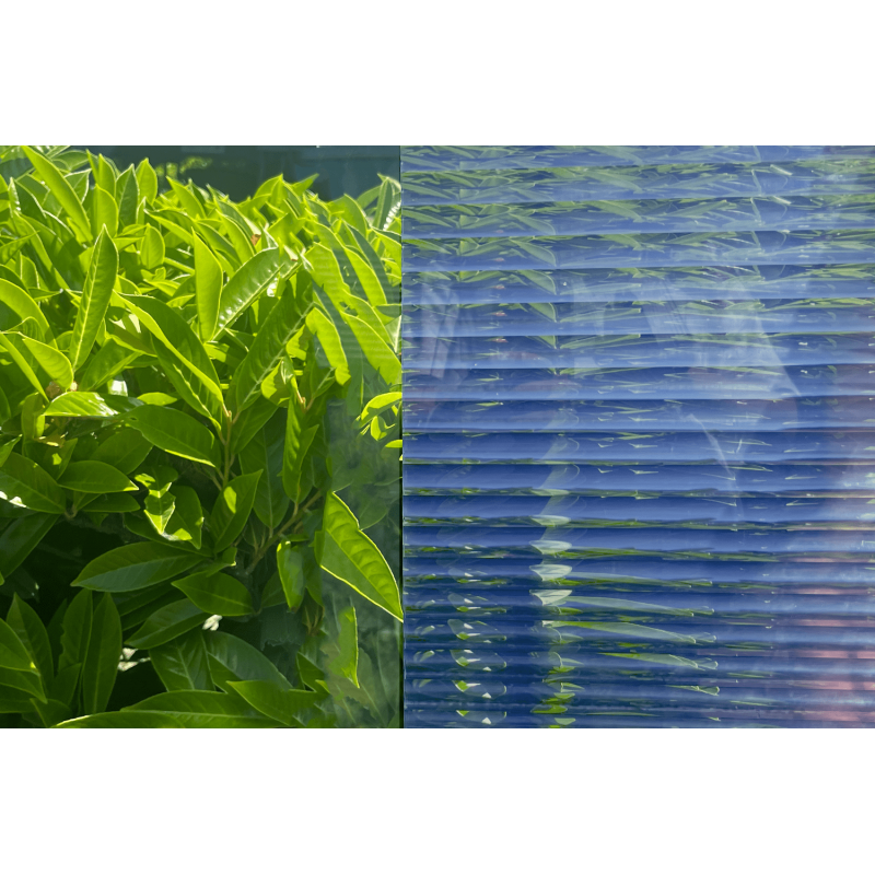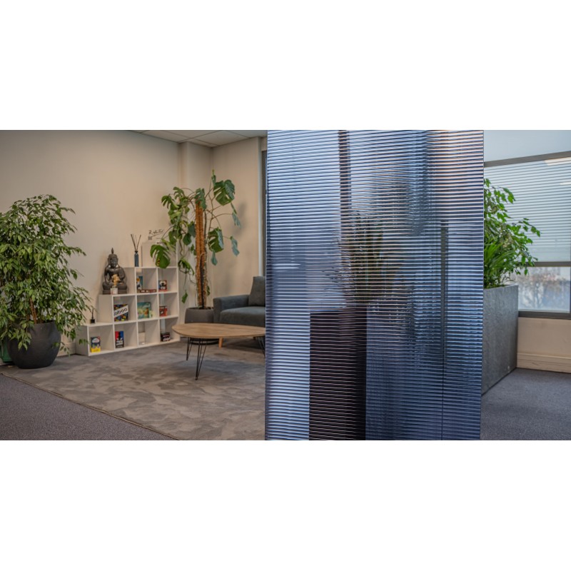 "Reflectiv offers a range of striped films that alter perspective and lighting effects. These films create a textured glass effect while providing varying degrees of privacy depending on the selected model. The STR 08 is a blue variant of the STR 06. The stripes are 1.5 cm wide