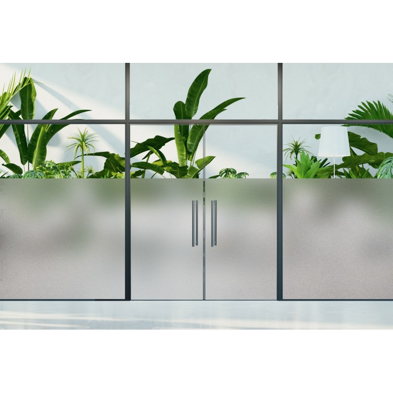 Esta película adhesiva convierte todo el vidrio en vidrio esmerilado gris. Oculta parcialmente la vista y deja pasar la luz, protegiéndote así de las miradas indiscretas. INT 401 es esmerilada gris, brillante, imprimible.