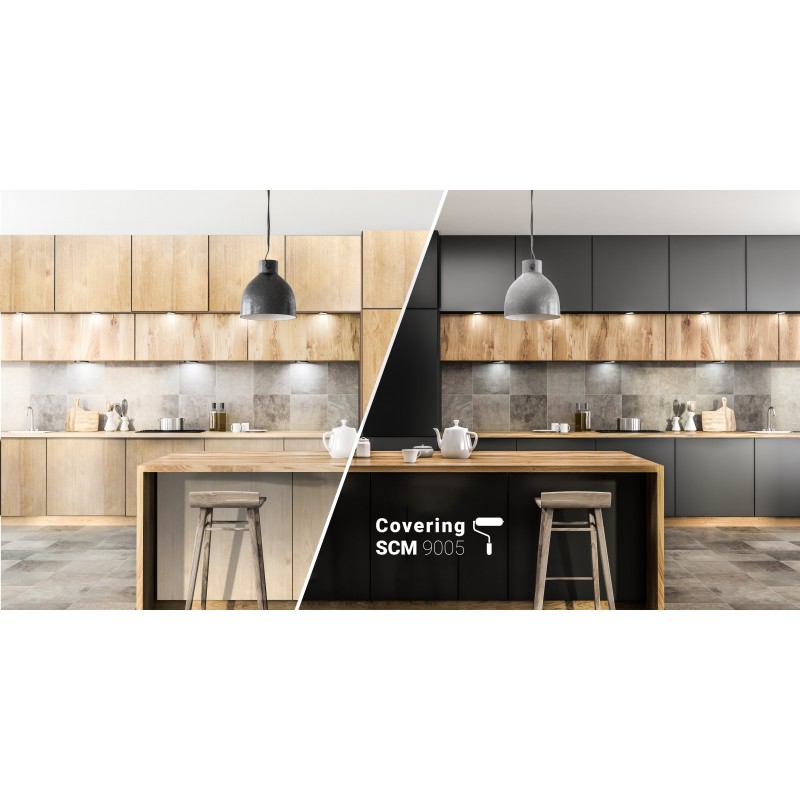 Este revestimiento negro, con su acabado mate ligeramente veteado, aporta carácter y elegancia a tus interiores.
