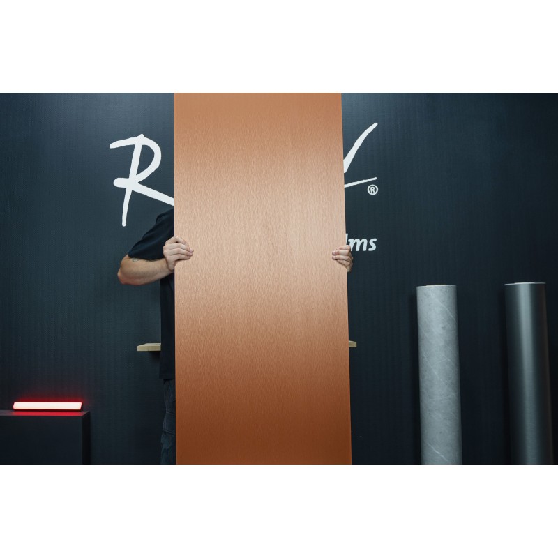 Este revestimiento imitación metal de color naranja destaca por su textura y acabado en naranja oscuro, aportando calidez y elegancia a tu interior. Su apariencia metálica cepillada refleja sutilmente la luz para un efecto refinado y contemporáneo.