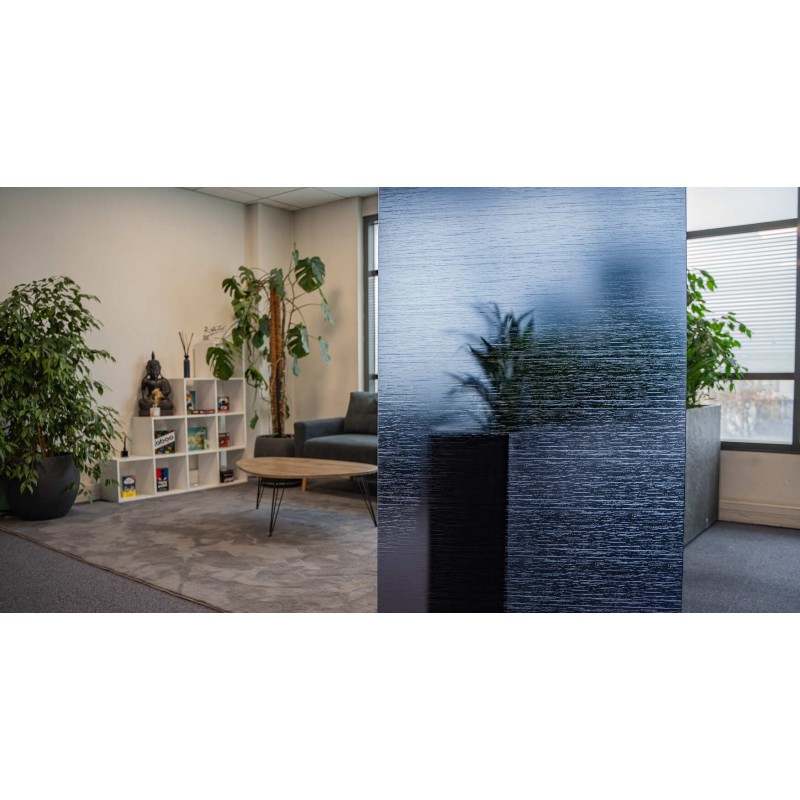 La película decorativa con efecto cepillado a rayas azules transforma ventanas, divisores o muebles de vidrio, manteniendo la privacidad. Esta película bloquea la vista exterior dejando pasar la luz natural, suavizando el brillo sin reducirlo. Añade un toque moderno y elegante a la decoración de tus proyectos.