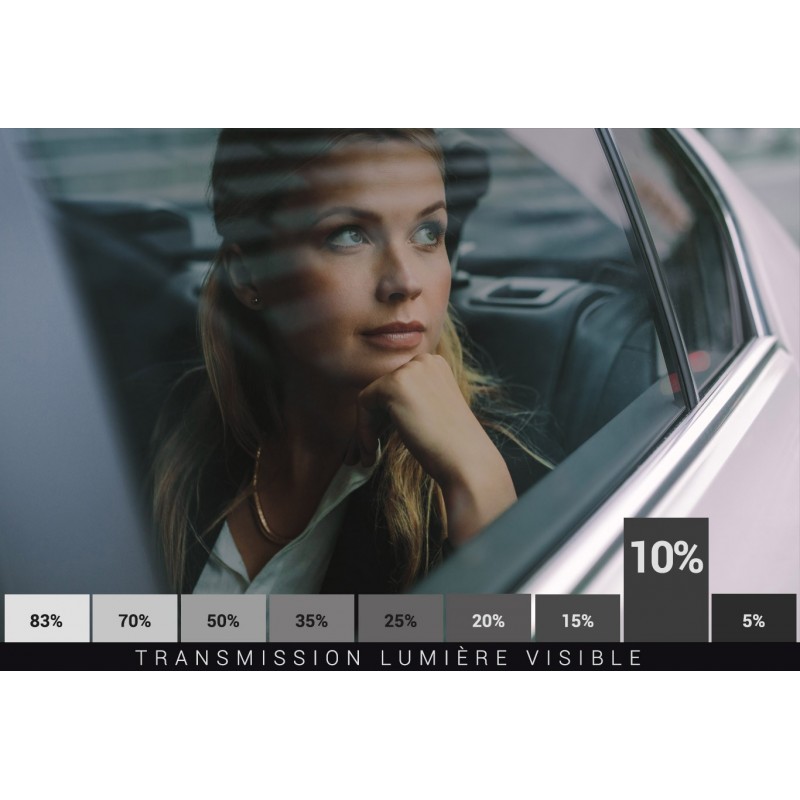 Film teinté pour voitures couleur noir transparent - Transmission d'environ 10 % de lumière visibleNotre film auto teinté de la série C&S laisse passer environ 10 % de lumière visible. Nos films adhésifs teintés  sont la solution idéale pour obscurcir les vitres de votre véhicule. Il recréent à la perfection l'aspect d'une vitre teintée, rehaussent l'esthétique du véhicule et rejettent la chaleur du soleil.