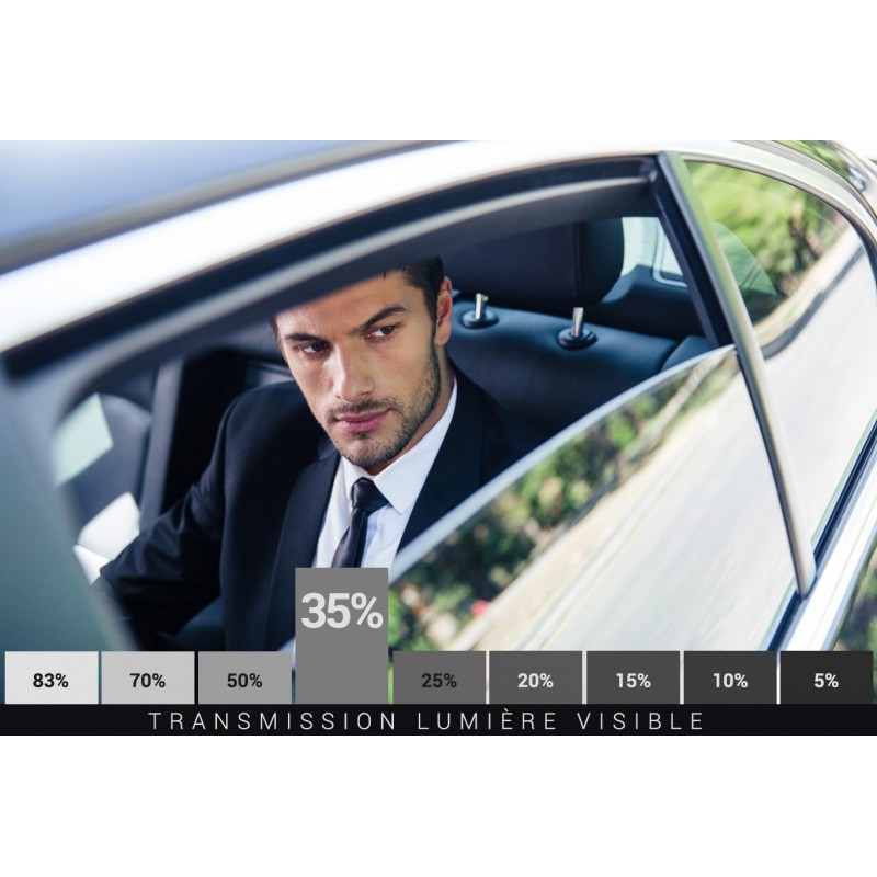 Film masse teinté pour voitures couleur gris moyen transparent - Transmission d'environ 35 % de lumière visible - Garantie 4 ans. Notre film teinté masse de la série D laisse passer environ 35 % de lumière visible. Nos films adhésifs teintés sont la solution idéale pour obscurcir les vitres de votre véhicule. Il recréent à la perfection l'aspect d'une vitre teintée, rehaussent l'esthétique du véhicule et rejettent la chaleur du soleil.