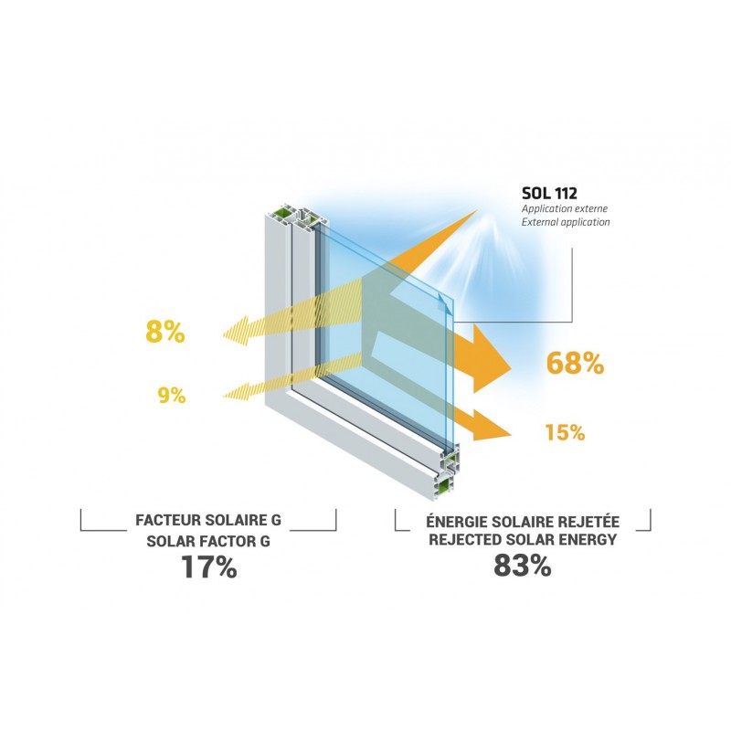 Film anti-chaleur SOL 112 protection solaire 83% pour pose extérieure. Le film de protection solaire SOL 112 a été conçu pour être appliqué sur les vitrages de façon à réduire la chaleur et l’éblouissement provenant du soleil. L’amélioration du confort est spectaculaire dans les locaux envahis de soleil. Il est un facteur réel d’amélioration du confort et permet des économies d’énergie liées à l’utilisation de la climatisation.