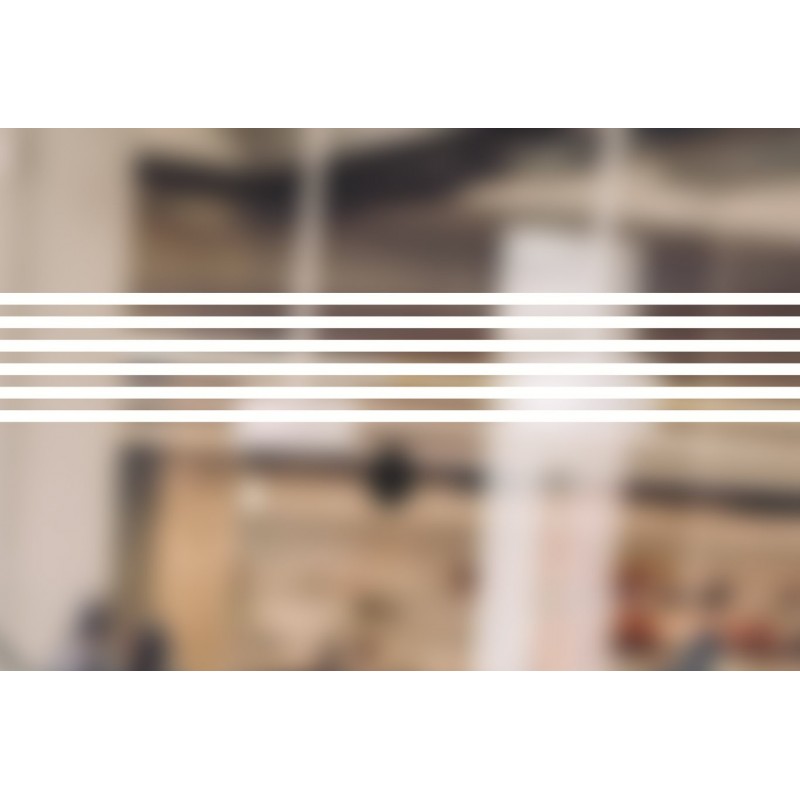 Bande de visualisation lignes blanches - obligatoires dans les lieux publics. Ces bandes permettent de mettre en évidence les vitrages de cloisonnement dans les lieux publics. Cette visualisation est rendue obligatoire lorsque les vitrages sont transparents et que ceux-ci se situent à la hauteur des personnes. Pour satisfaire à cette obligation il est nécessaire d’utiliser un film adhésif pour vos vitres. Il est recommandé d’utiliser deux bandes horizontales visible d’une largeur de 5 cm situées à 1,10m et 1,60 m de hauteur.