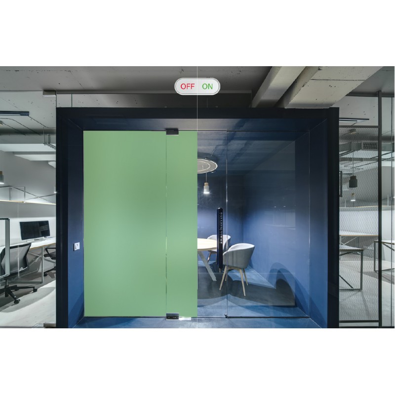 Film électrique avec opacité commandée. Passer d'un vitrage transparent à opaque colorée en vert est désormais possible grâce à notre technologie à cristaux liquides.