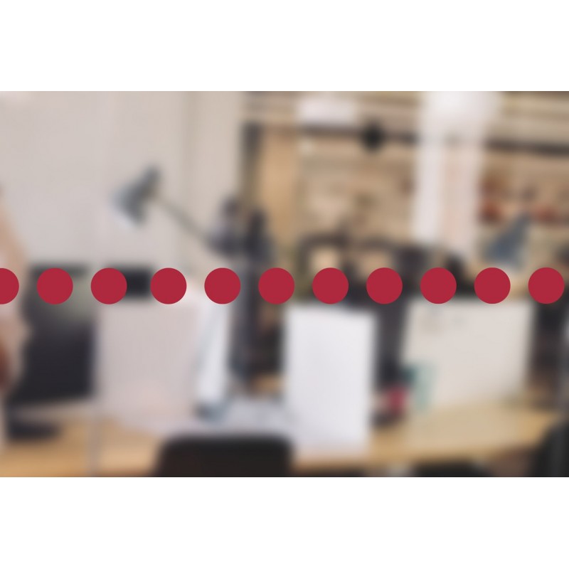 Visualizzazione cerchi rossi - obbligatoria nei luoghi pubblici. Queste strisce sono utilizzate per evidenziare le vetrate divisorie nelle aree pubbliche. Questa visualizzazione è obbligatoria quando i vetri sono trasparenti e situati all'altezza delle persone. Per soddisfare questo requisito, è necessario utilizzare una pellicola adesiva per i tuoi vetri. Si raccomanda di utilizzare due strisce orizzontali visibili larghe 5 cm situate a 1,10m e 1,60m di altezza.